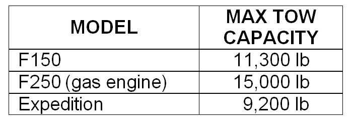 So using the Gross Combined Weight Rating (GCWR) for the truck of 15,000 lbs minus the Gross Vehicle Weight of the Expedition of 6,075 lbs, we can tow a 8,925 lb trailer.