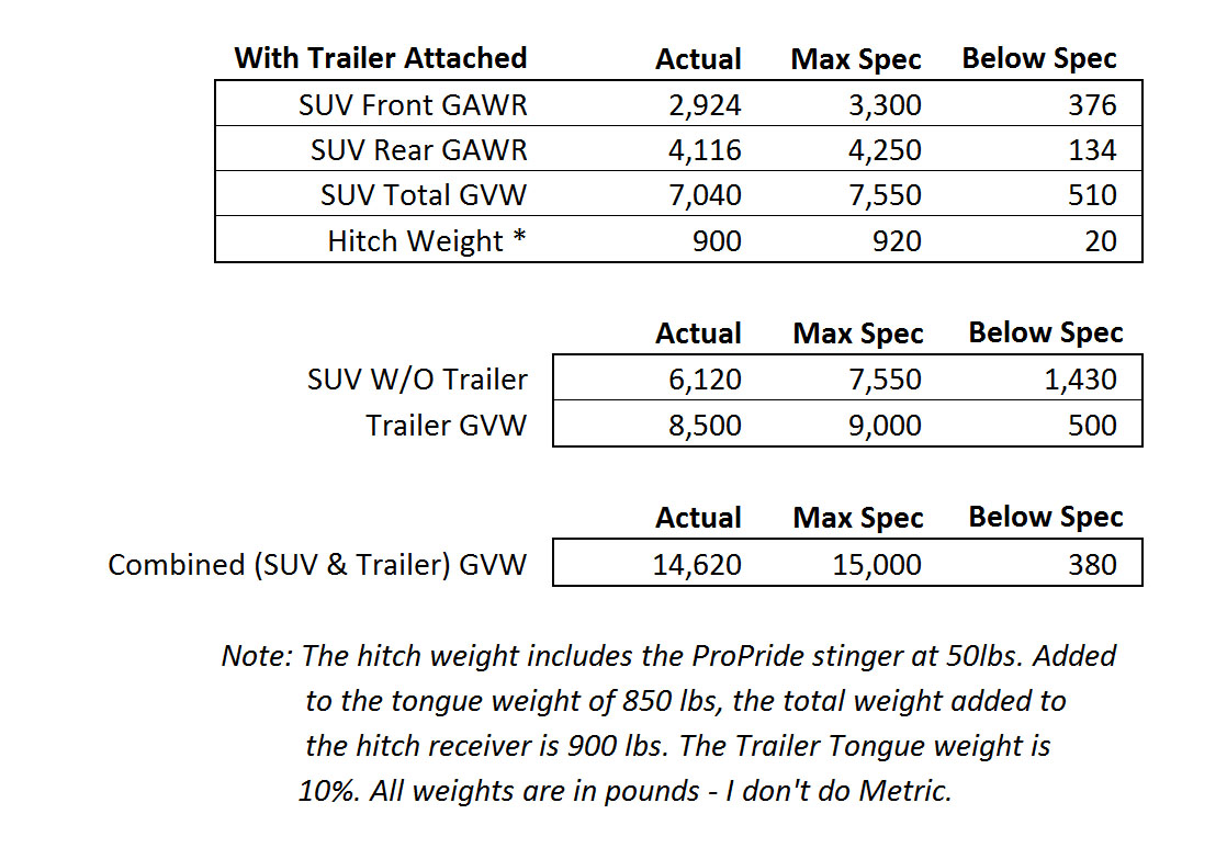 UPDATE (Jan 16 2017): In the text above I added the weight of the ProPride Hitch to the tongue weight. I have changed how I weigh tongue weight using the ProPride Hitch. Also, for a complete discussion on how tongue weight should be calculated see this post on Weight Distributing Hitches and Tongue Weight.