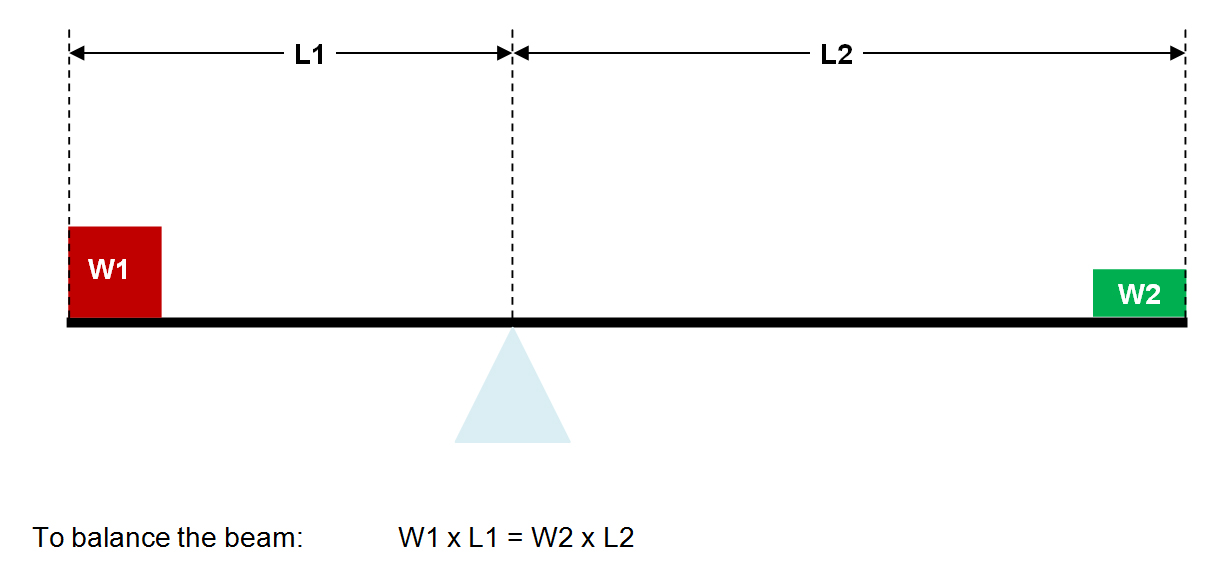 The force at each end of the beam is calculated by multiplying the weight at the end by the distance to the center (fulcrum). Using the formula, one can calculate the needed weights to balance the beam, or even apply a specific weight at one end, which in our dilemma would be the trailer tongue.