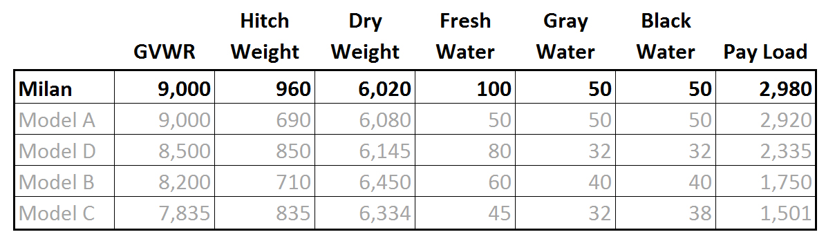 Notice that the Milan has the highest hitch weight and the highest ratio of hitch weight to GVWR. It also has the highest payload rating. And it has the largest fresh water capacity at 100 gallons, which is about 835 LBS full.
