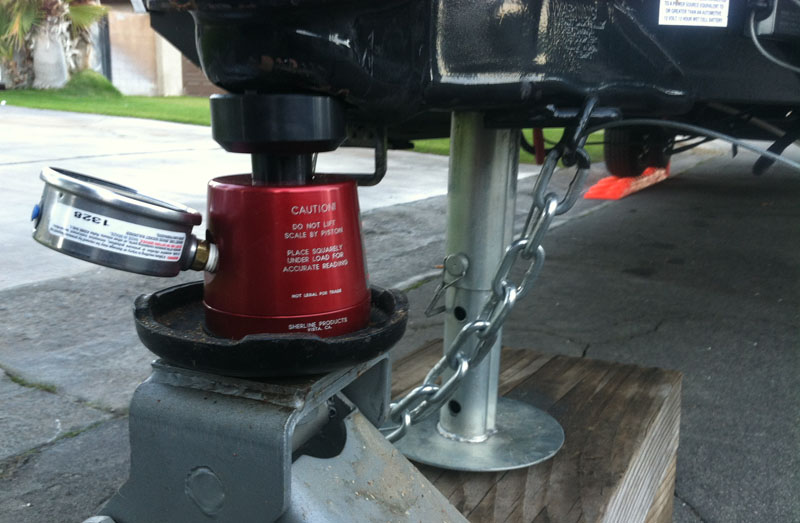 This scale can be placed under the trailer tongue jack, which isn’t exactly accurate (probably reads 5%-8% heavy), or using the included adapter it can be placed in the trailer’s hitch ball socket.