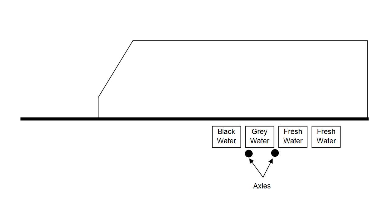 Toy Haulers are travel trailers with a rear section designed to transport off road vehicles and fuel. They carry a lot of weight in the rear and must be designed to balance this load with the rest of the trailer. Because of this weight requirement, they are “hitch heavy” from the factory and have a frame designed to handle this load, and to handle the additional stress of off–road travel. This philosophy has carried over to several of their Milan travel trailers. So I wasn’t surprised by the weight specifications. To balance the load properly, I figured the fresh water tanks were probably to the rear of the axles, similar to the weight distribution for hauling off-road vehicles. I was correct.