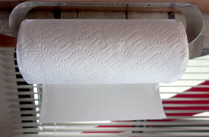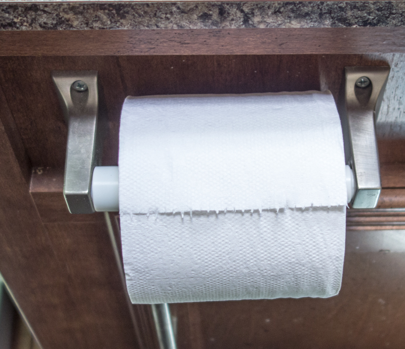 So I installed the much too expensive metal unit and inserted a paper towel roll. When we got to the campground she looked at the paper towels and asked, “Why did you put the roll in backwards?”