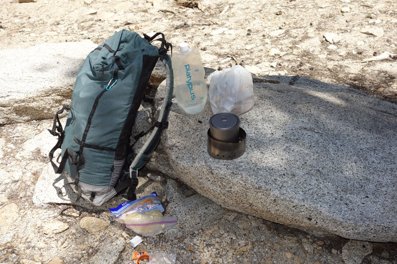 Above: This was taken in the San Jacinto Mountains where fire is a serious danger. The stove uses the solid fuel, Esbit, which is pretty darn difficult to tip over. Notice that the stove is on a flat boulder, and even if I knocked it off the boulder, the area below it has no combustible materials.
