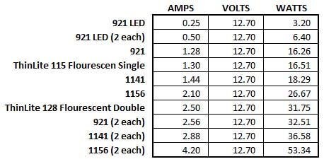 A single 921 auto bulb draws 1.28 amps, a 921 LED bulb only .25 amps.