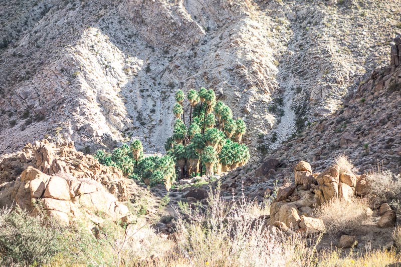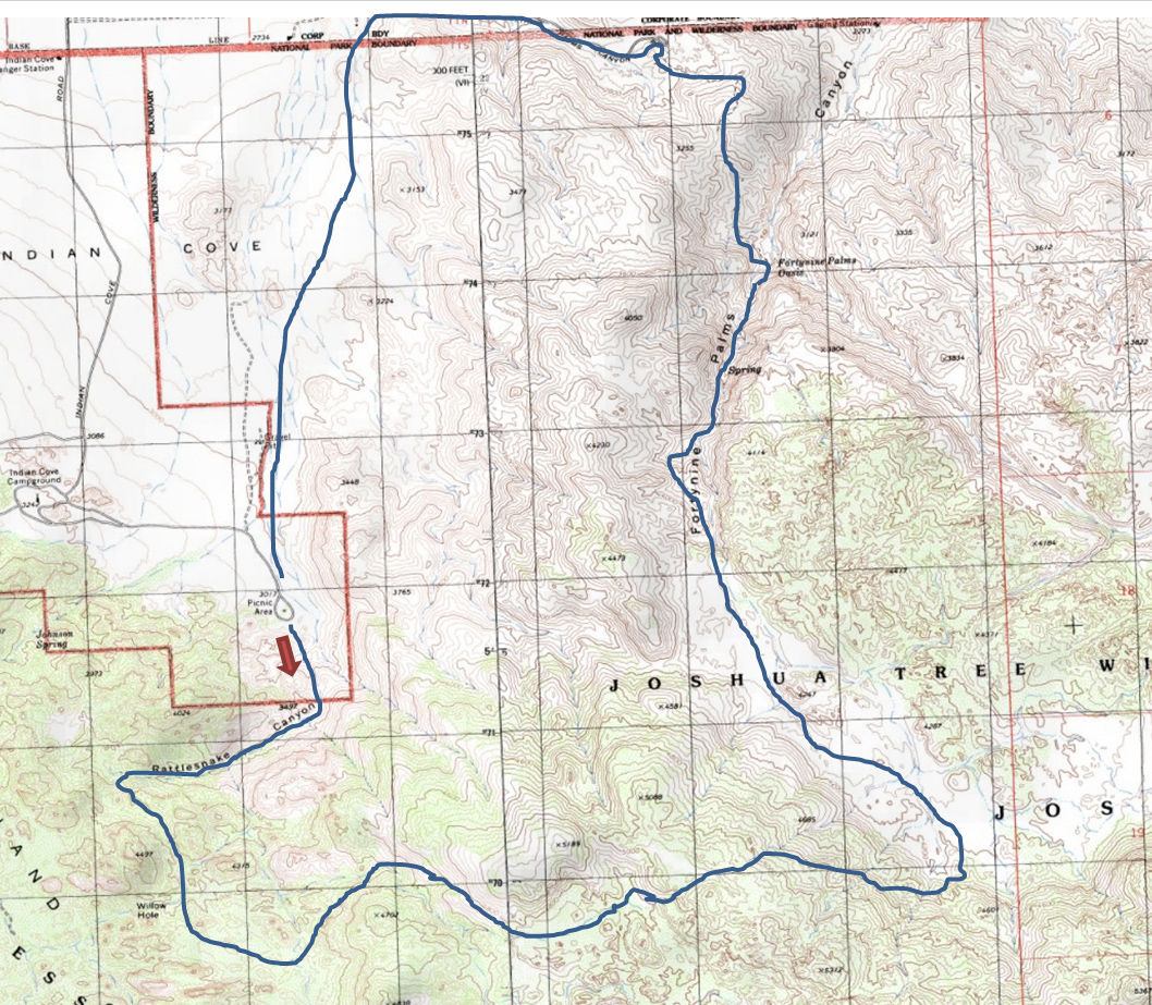 I would have to park my SUV just outside the Joshua Tree National Park boundary (not overnight parking allowed in this part of the park), hike in to the mouth of Rattlesnake Canyon, hike up the canyon, then hike eastward until I could descend into Fortynine Palms Canyon. Once at the palm oasis, there is a two mile trail that would take me to a paved road, out of the park, where I could hike cross country back to my vehicle.