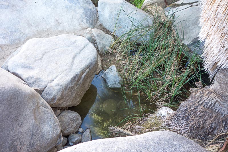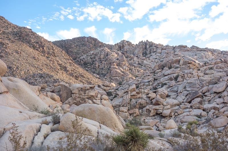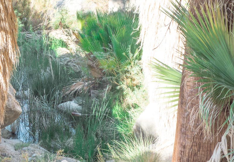 Once out of the canyon, I headed westerly in the Wonderland of Rocks to Willow Hole. From there I zig-zagged my way to the head of Fortynine Palms Canyon where I would descend (hopefully) to find water. The hike required several false routes as the terrain was too steep in places to descend. Finally, and in one piece, I got to Fortynine Palms Oasis, where there was plenty of water.