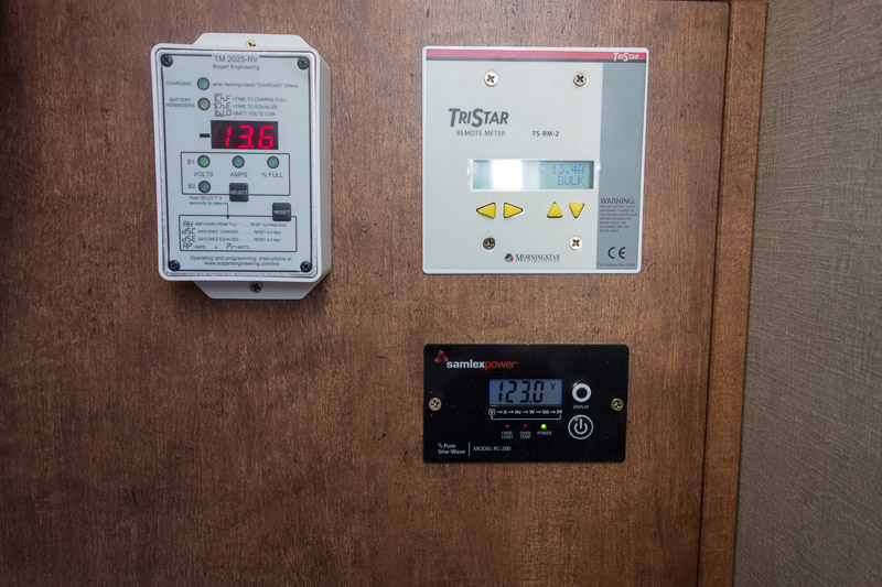 I decided to mount the Trimetric 2025RV, the Solar Controller Remote Display, and the Samlex Remote On/Off Switch in the bedroom, which is close to the storage compartment. Plus Joyce didn’t want a bunch of gadgets in the living room or kitchen area.