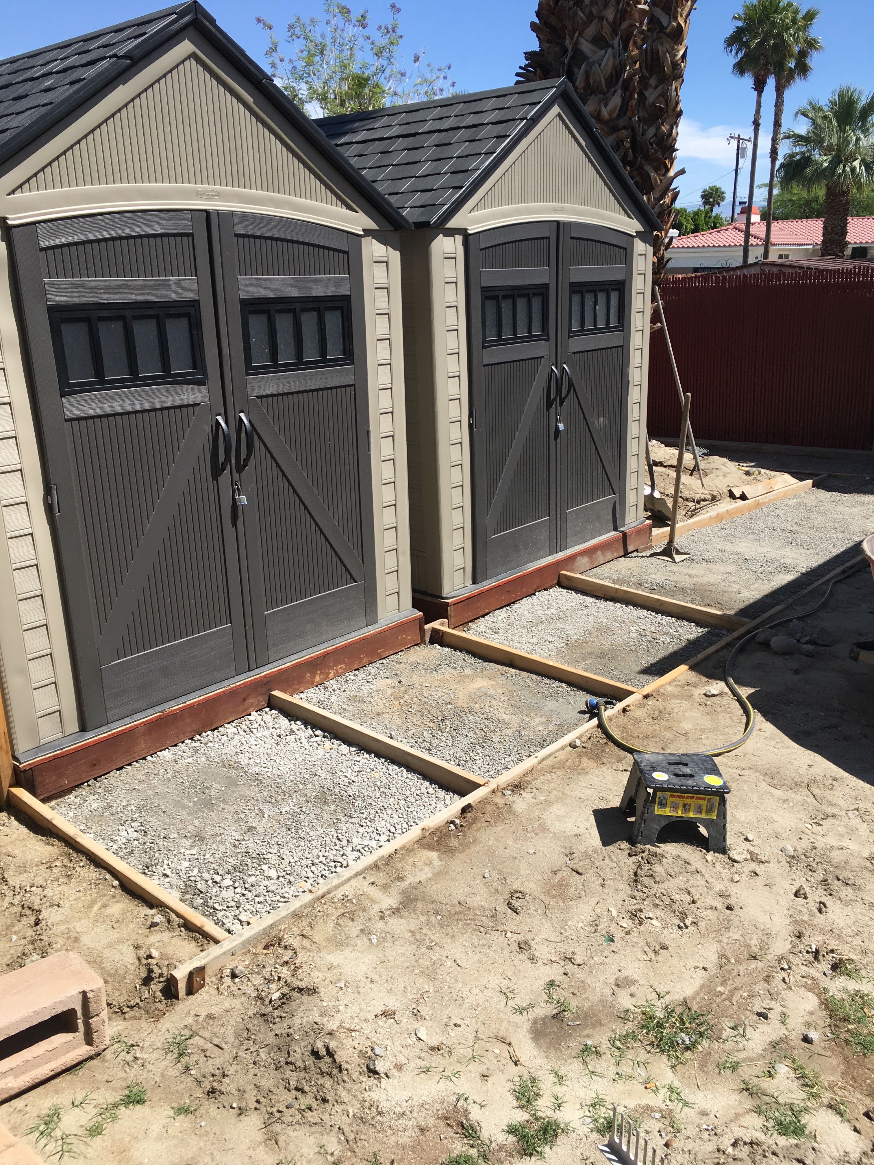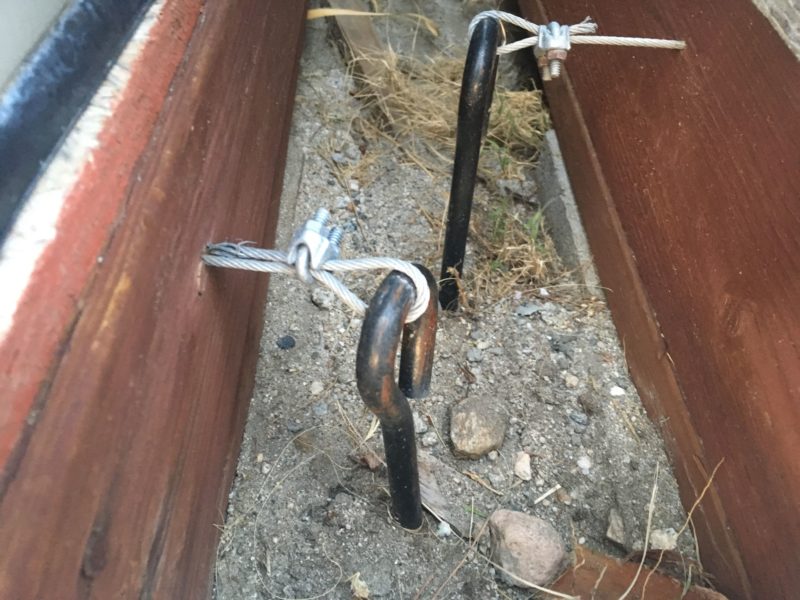 These sheds keep tools and other things organized. We live in an area that can get windy, and the properly way to install a shed is place it on a solid foundation, and anchor it to the ground. I built sled foundations our of 2” X 8” pressure treated lumber, with 4’ X 8’ X ¾” OSB panels. The foundation is anchored to the ground using two steel cables for each shed foundation that are connected to two 15” auger pegs on each side of the shed; the same pegs we use to secure our Coolaroo shades. The shed floors are screwed to the wood sled foundation.