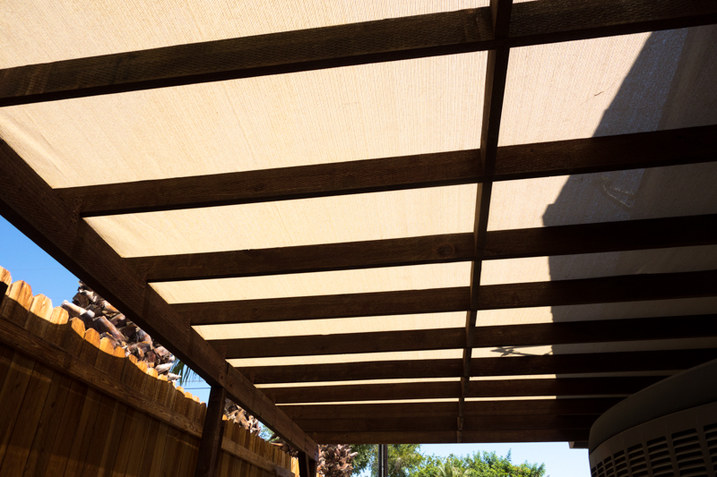 The shade cloth is manufactured by Coolaroo (got a good deal on Amazon) and blocks 95% of UV radiation, so it should last several years, and we have to option to install a solid roof without changing the supporting structure.