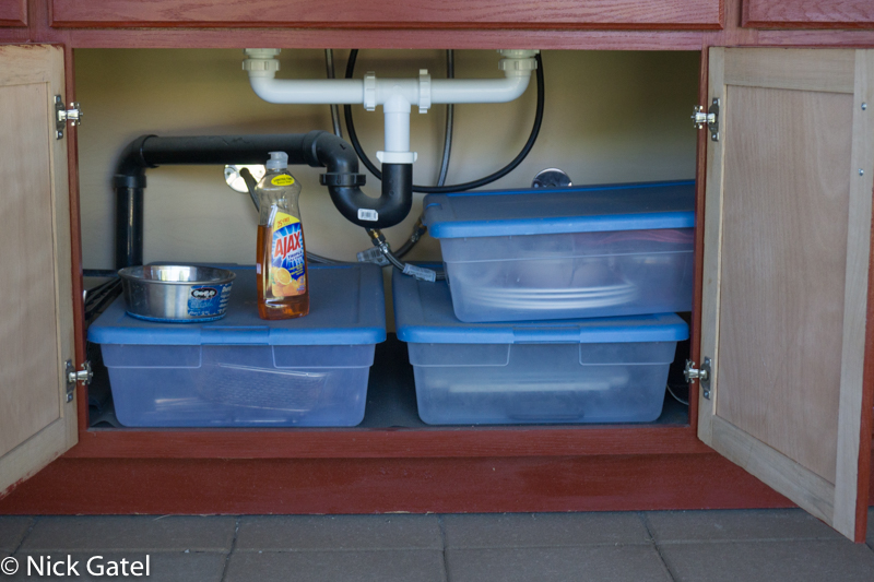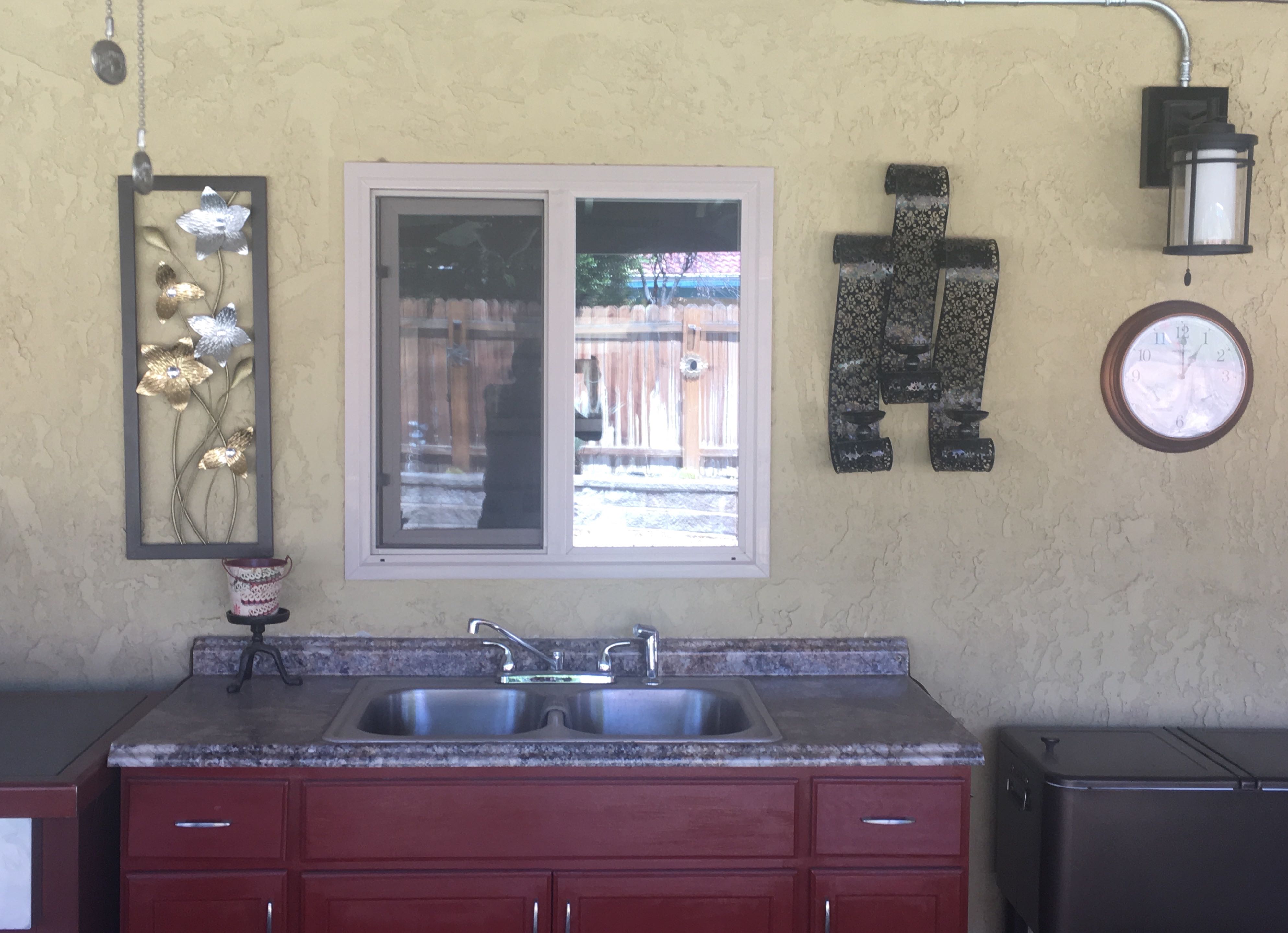 We bought a cheap sink cabinet and painted it, added a Formica counter top, stainless steel sink and faucet. We placed it under the kitchen window that is above the inside kitchen sink, so it was easy to hook up cold and hot water lines, and the sewer connection.