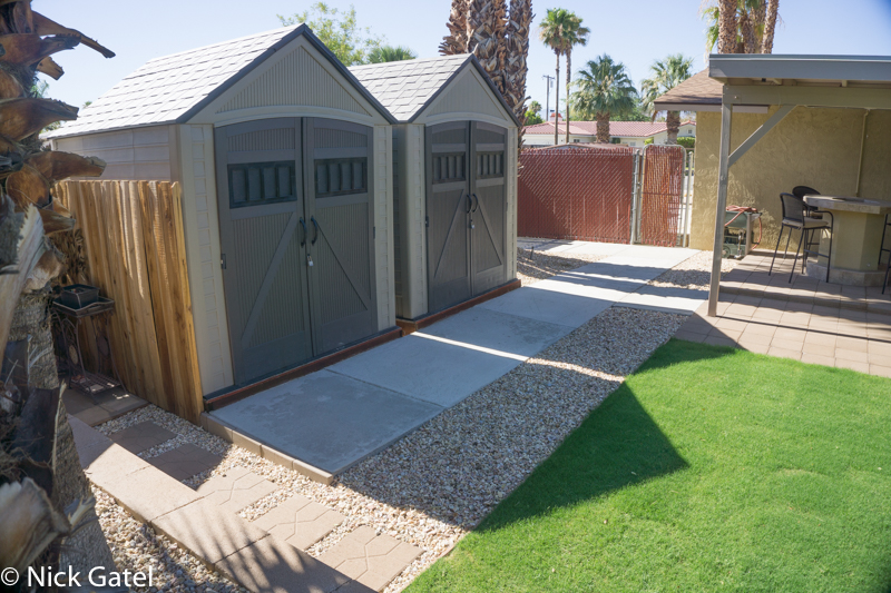 At one time the entire backyard was covered in lush grass. Living in a desert and considering the ongoing drought in California, large lawns don’t make sense. We had already removed the grass lawns in the front yard, replacing them with desert landscaping that is mostly 3/4” colored gravel. We used the same gravel in the backyard, but still wanted a little greenery in our little desert oasis. So we put in a small lawn that also serves as another outdoor living area.