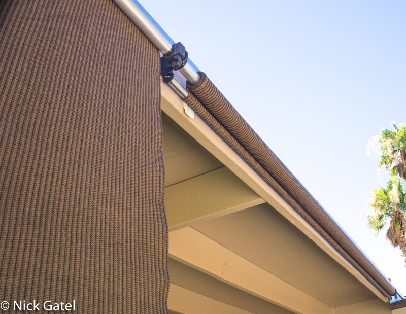 We had already installed a solution for the late afternoon summer sun on this side of the patio – an 8’ X 6’ and a 6’ X 6’ sun shade by Coolaroo that we bought at Lowe’s, the same ones we installed on the windows in the front of the house.