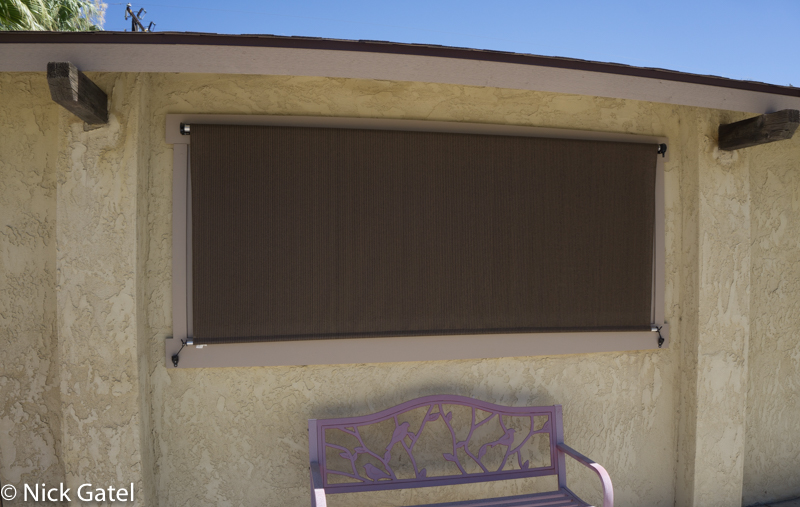 Here’s a picture of one of the shades in the front of the house. We leave them down for about 6 months, and roll them up the rest of the year. After a year, all of them look practically new.