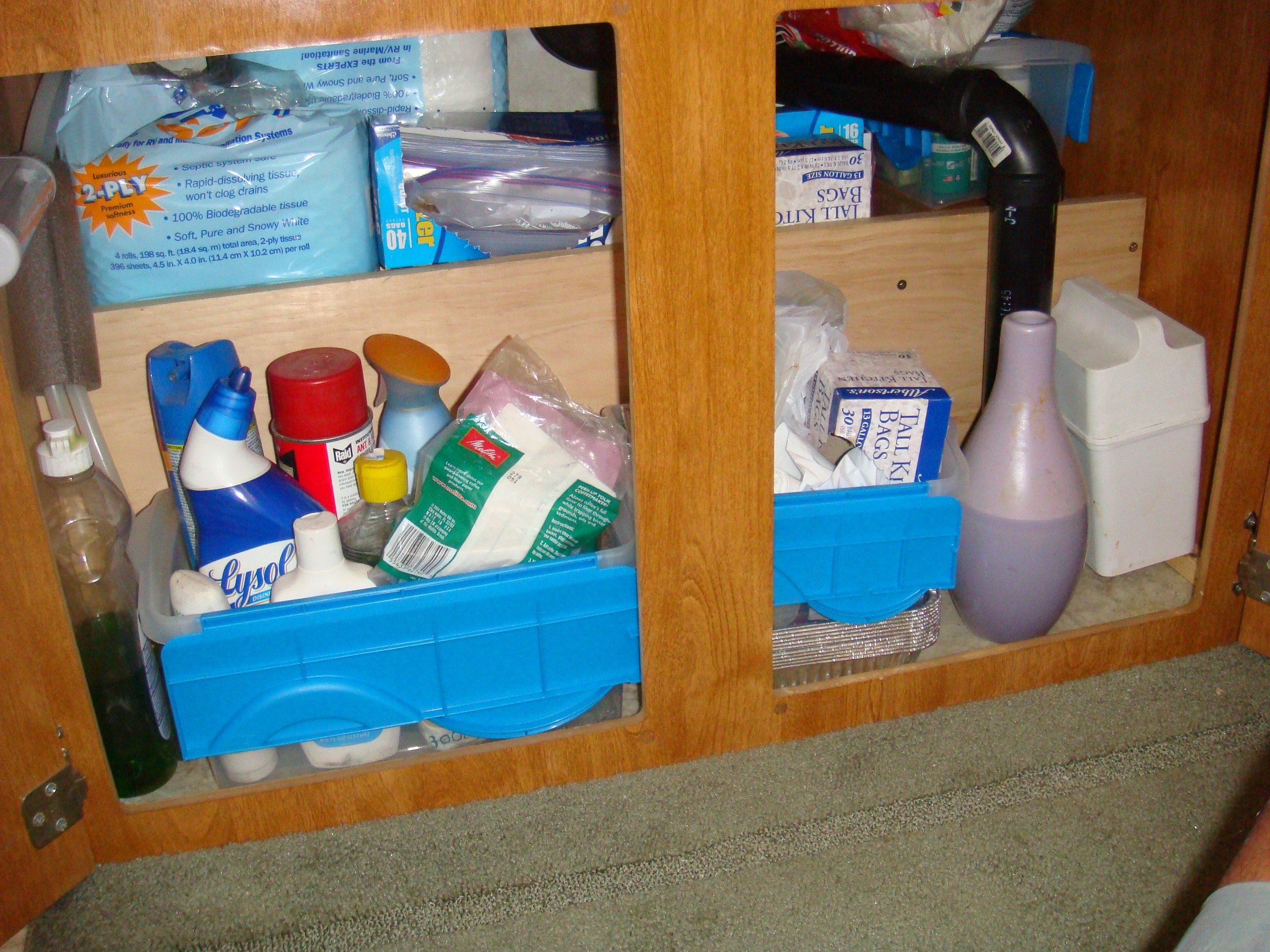One of the reasons we purchased our 2006 Fleetwood Niagara was because of all the extra storage it had compared to our much smaller 1992 Starcraft Meteorite. We were just tired of packing stuff for each trip and hauling it out to our tow vehicle on every trip. A large camper would allow to store just about everything we needed for camping in the camper itself. But the storage in the Niagara wasn’t optimal for our use. Here are a few things we did.