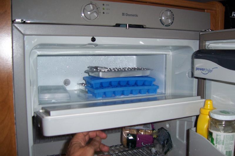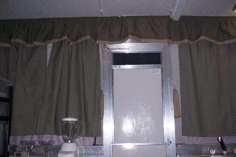 Shower door is stored on dinette during travel