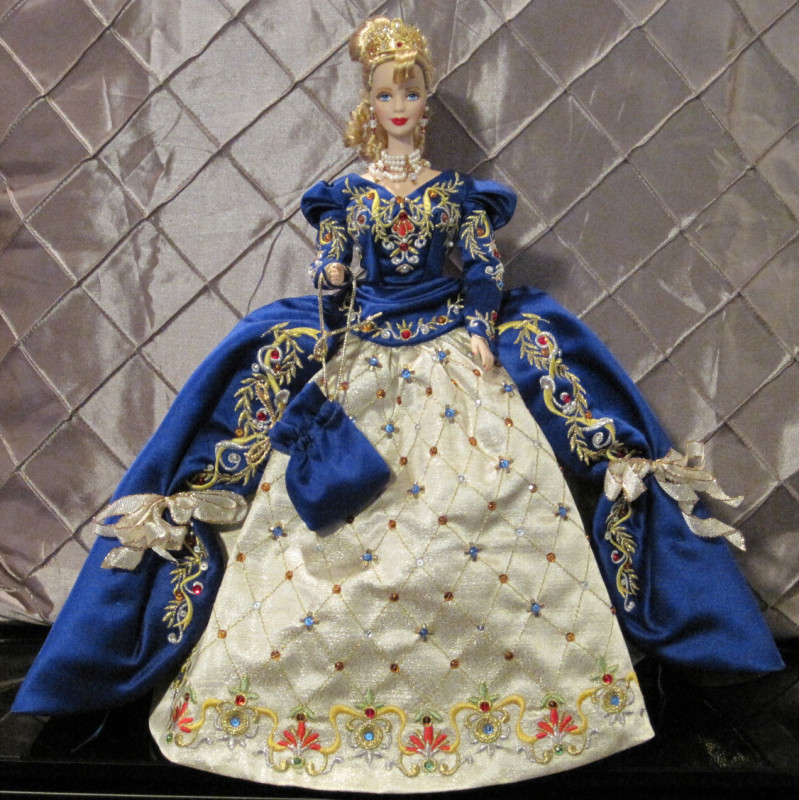 Handcrafted in fine porcelain bisque, Faberge Imperial Elegance Barbie doll wears a regal gown of rich blue satin with a golden lamé underskirt. Both are lavishly embroidered with over 50,000 stitches and accented with over 175 hand-sewn gleaming Swarovski crystals. 22K gold-plated latticework adorns her stunning, egg-shaped evening bag, which opens to reveal a miniature Swarovski crystal heart. Her elegant faux pearl choker, golden and crystal drop earrings and dazzling tiara covered in 22K gold-plate add to the splendor that makes this one of the most glorious Barbie dolls ever. Hand numbered in 22K gold and limited to a worldwide production of 15,000 units. She is the first porcelain Barbie doll to use the Mackie head mold.