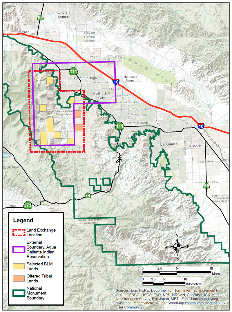 In a proposed land swap between the BLM and the Agua Caliente Band of Indians in Palm Springs the BLM wants to trade about 9 square miles in the Santa Rosa and San Jacinto Mountains National Preserve for a little over 2 square miles of land currently owned by the Band.
