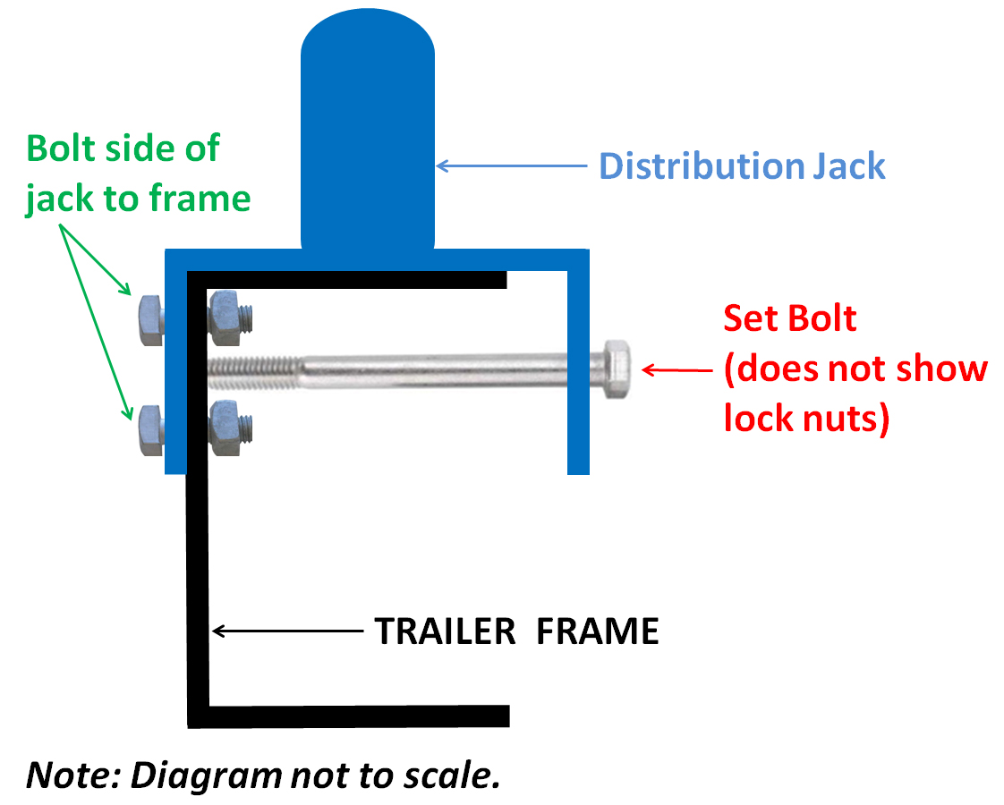When the jacks tilted outward, the outboard side of the jack frames were bent. To better understand how the jacks attach to the trailer tongue frame, view the diagram below. This is a rough diagram of the bolt-on solution. It does not show the lock nuts used on the long “set” bolt.