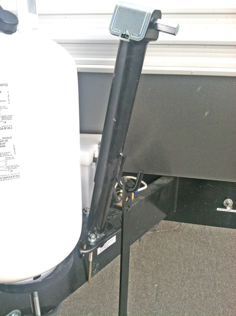 A couple days after the installation I had problems with both jacks, on a pre-trip road test. The base of the jacks straddle the trailer’s tongue frame and must be wide enough to fit a multitude of trailers. To secure and tighten the jack’s base frame against trailer frame, a 1/2 inch diameter bolt is used as a “set screw” type of affair. Because our frame is a C-Channel construction versus a much wider tube frame, the set-bolt must reach a long distance. Any minor distortion will cause the bolt to move and eventually or even quickly cause the jack assembly to tilt.