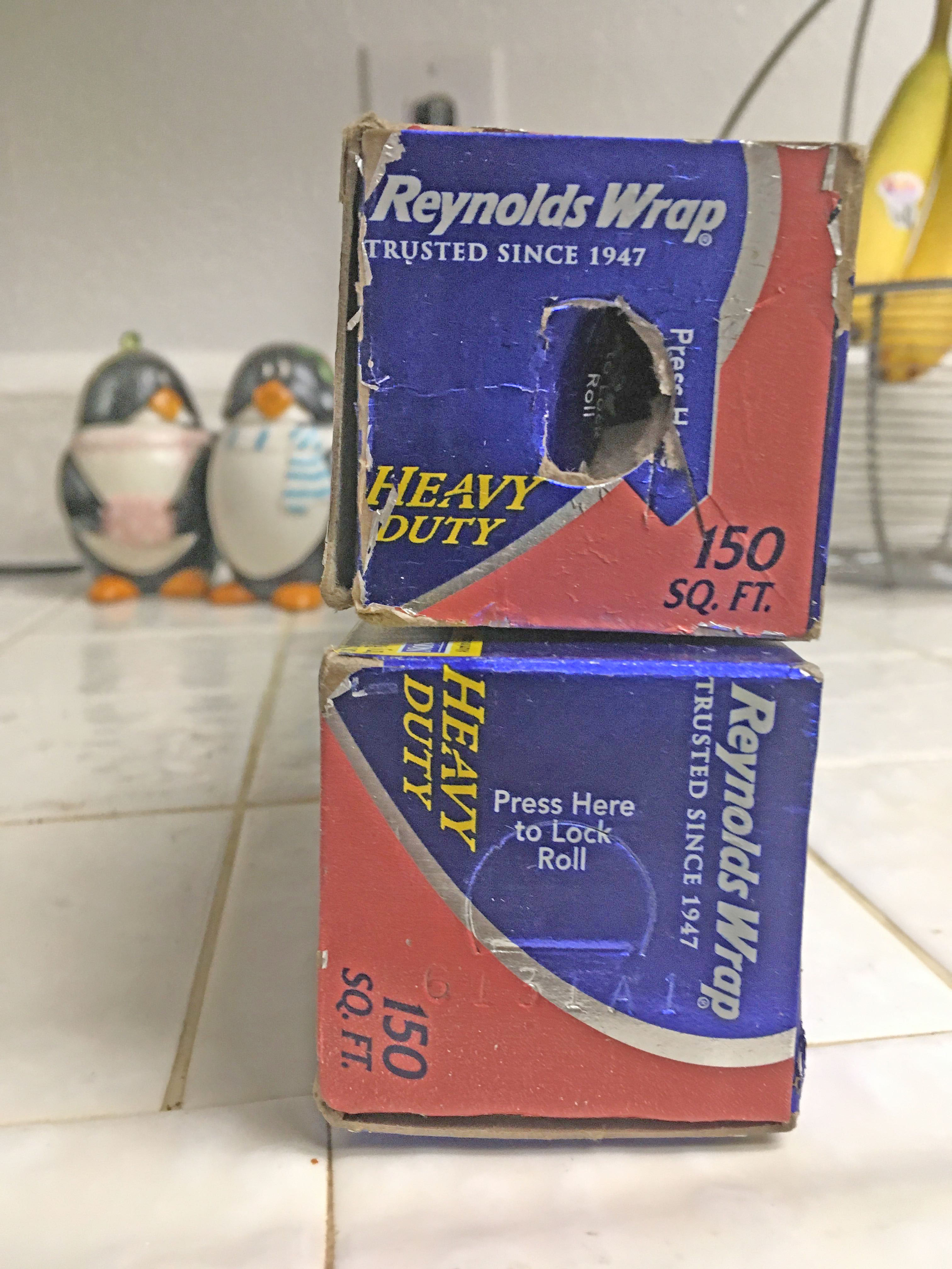One thing I noticed is Joyce often uses aluminum foil to cook and store food. And we have lots of aluminum foil. So I started to use it too. Right away two conundrums popped up. First, aluminum foil has a shiny and a dull side. Which side goes towards the food. The second, was the roll of foil kept falling out of the box.