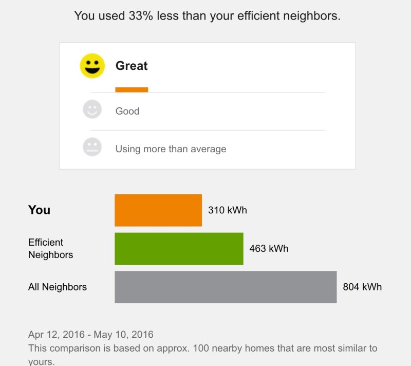 Each month, since the beginning of the year, I have been posting our energy usage versus the 5 year average prior to all the upgrades, which are covered in this post. The numbers don’t mean a lot if you don’t live here. So how are we doing relative to similar homes in the area? Southern California Edison sent this analysis for last month. We’re doing great.