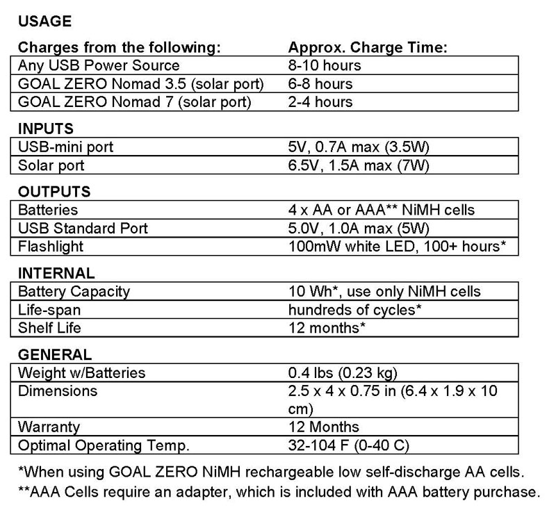 The unit includes a LED flashlight, on/off switch, and a port to charge it from the GoalZero solar panel or any USB 5 volt source. The light and the USB output port are in the center of the unit. Above the on/off switch is an indicator light (green, yellow, red) to show the battery pack’s state of charge.