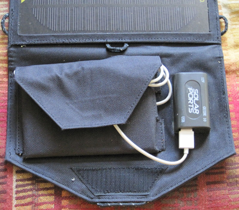 Above: The panel includes a smaller pocket to store an electronic device or battery back while charging. Here is my iPhone, so you can get a feel for the size.