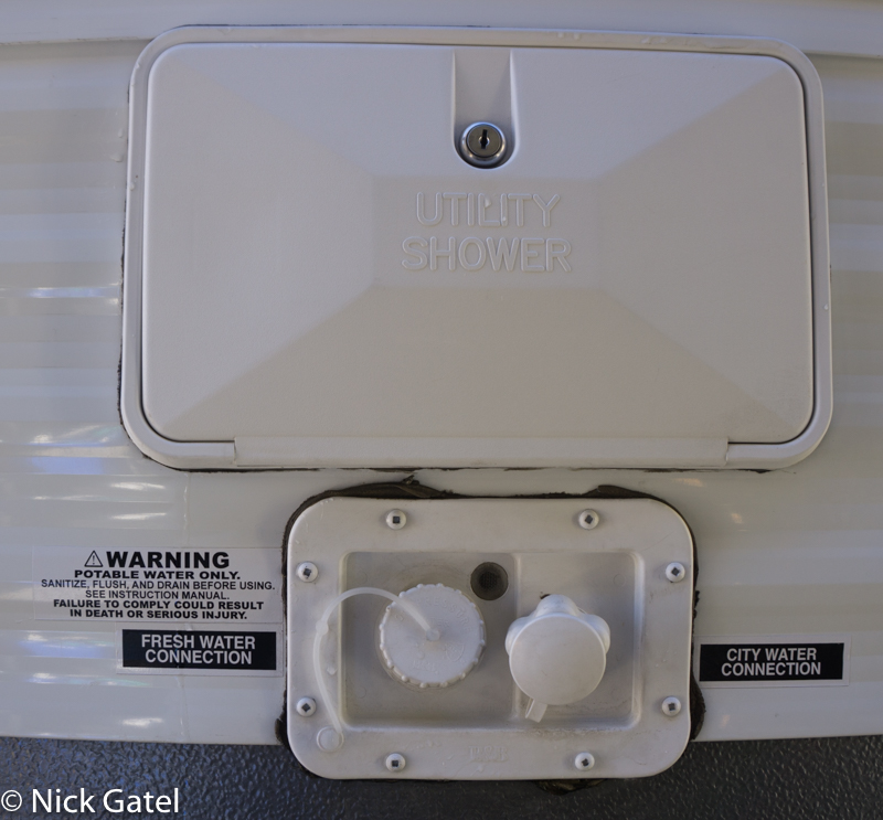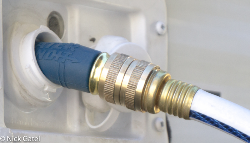 Most RV’s have a fill hole for the onboard tanks and a “city water” connection to connect directly to a water bib. Since we almost never camp where we can connect to water, we must rely on water we fill our tanks with.