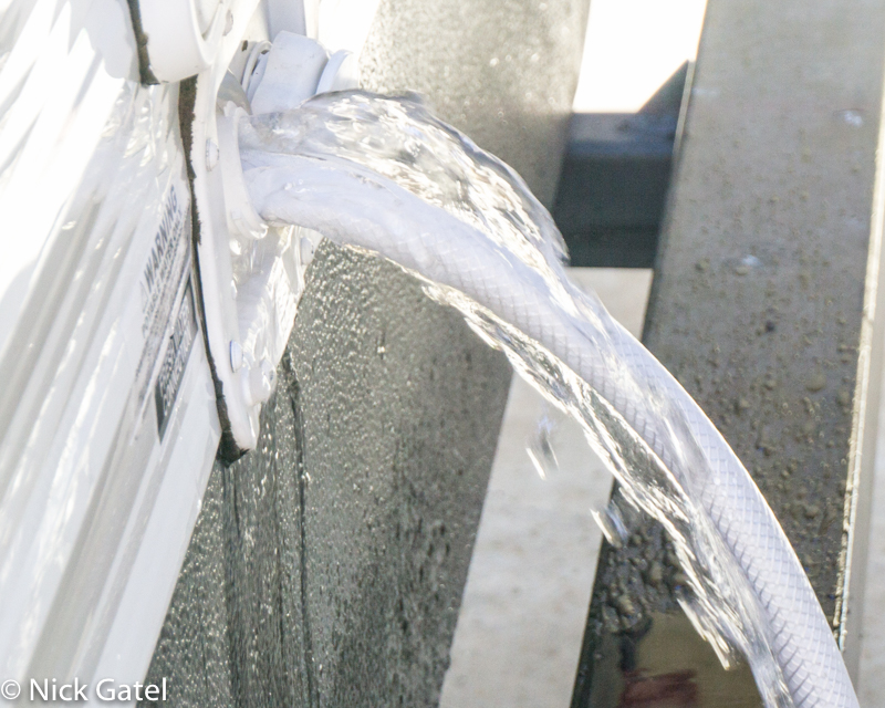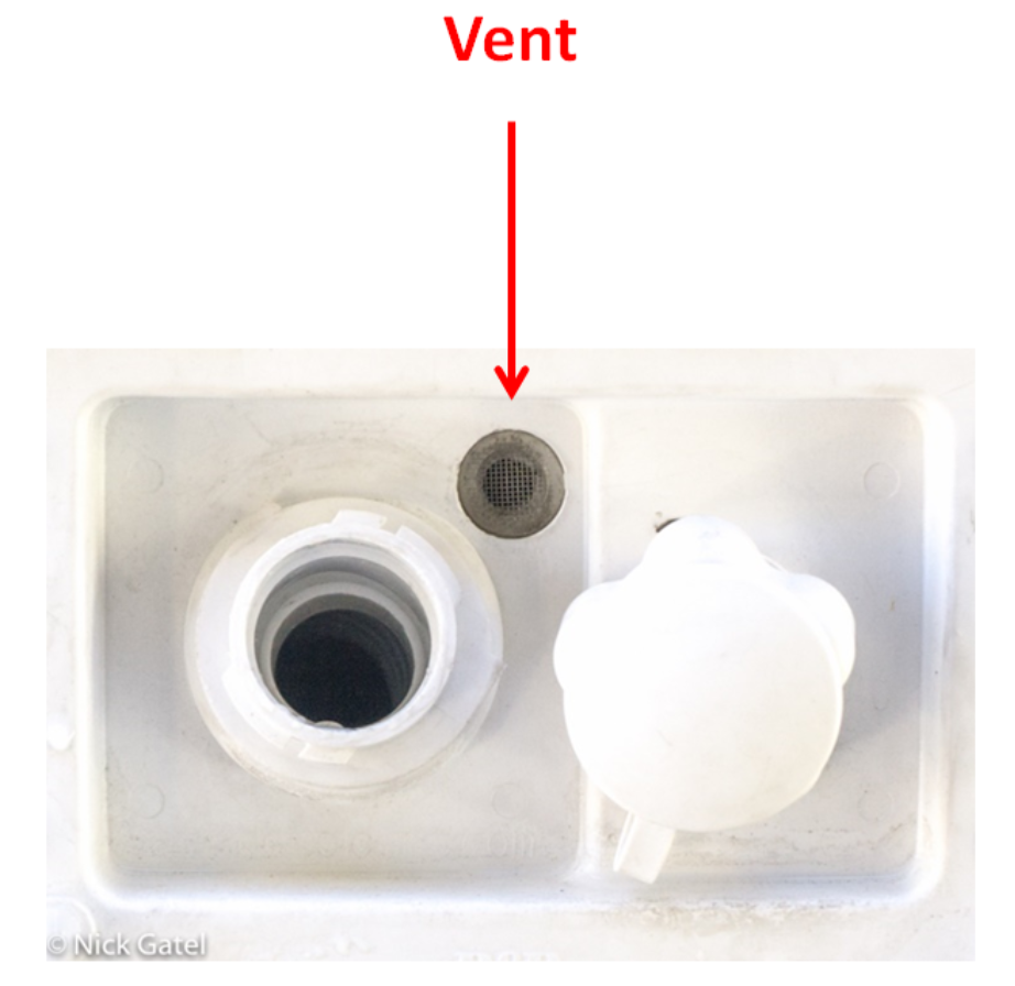 I found that if I stuffed a rag into the fill hole around the hose, it kept water from backing up and more efficiently forced the air in the tanks to move through the vent systems. This didn’t create unwanted extra pressure. But who wants to stand around holding a rag in place.