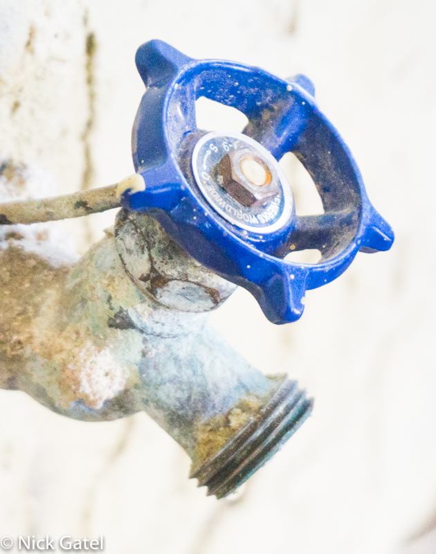 Note that I am using a white water hose. Water hoses that are designed for potable water are white. We carry 3 of these hoses; two 50 foot hoses and a 25 foot hose. There have been a few times where we were camped in campgrounds that have water, but not at each site. 125 feet of water hose has usually allowed us to fill our tanks without moving the camper — site selection is important 🙂
