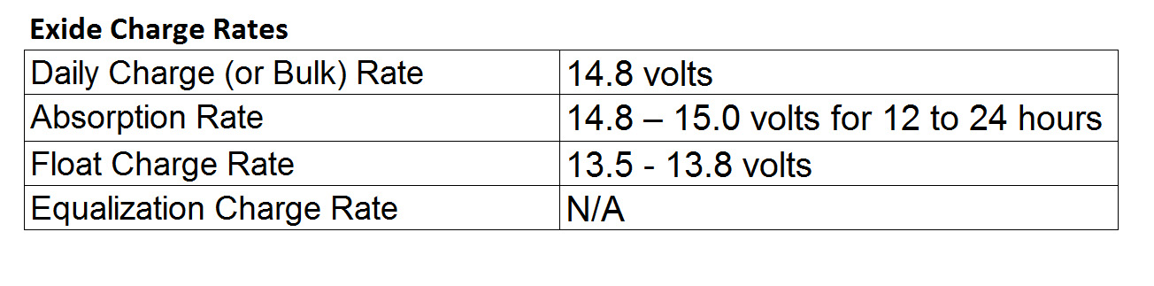 And Exide recommends the following for their deep cycle and marine dual purpose batteries: