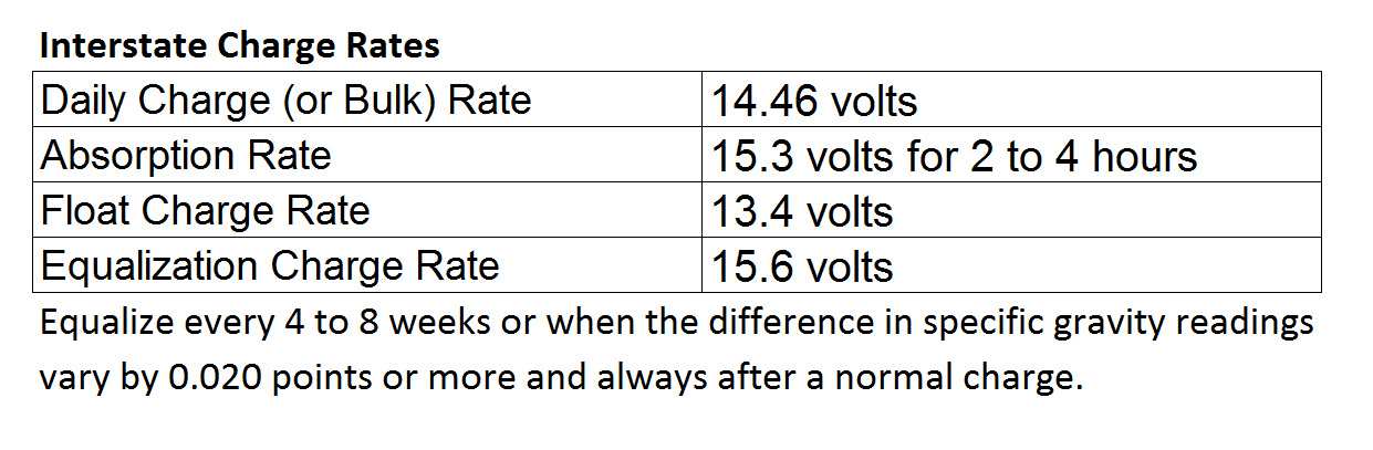 This was for all of Interstate’s flooded deep cycle batteries. However their chart does not include their RV/Marine Deep Cycle batteries. Nowhere on their site can I find specific instructions for charging an RV/Marine Deep Cycle battery. However, I did find this statement: