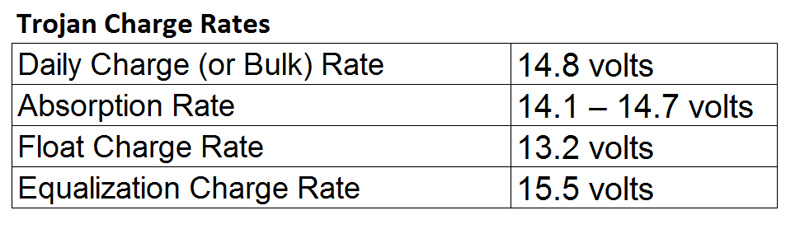 As I stated earlier, most automotive alternators put out around 13.8 to 14.2 volts when recharging battery. RV Batteries require a different strategy and values. There are 3 stages plus a special situation called equalization, and Trojan recommends the following at 77 degrees F: