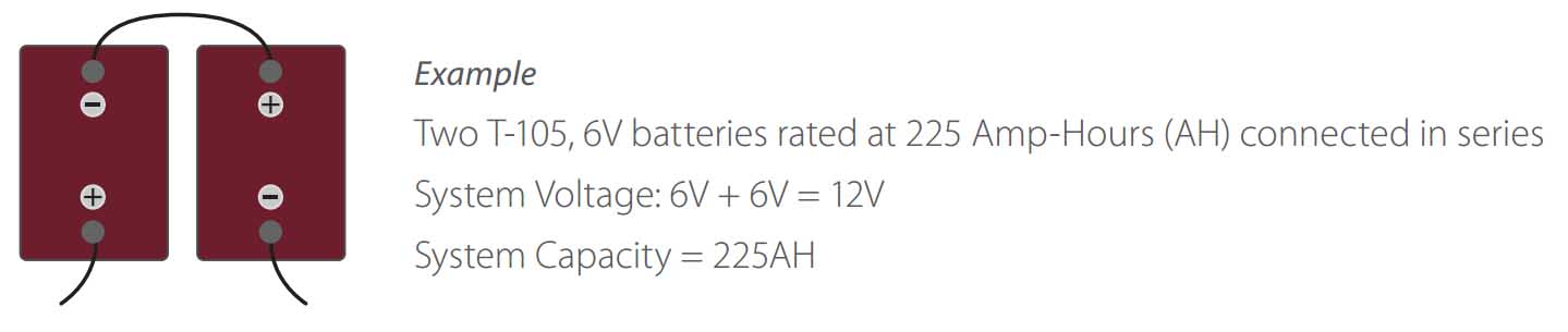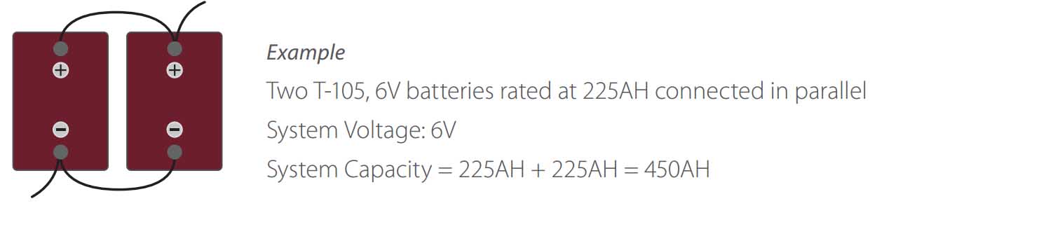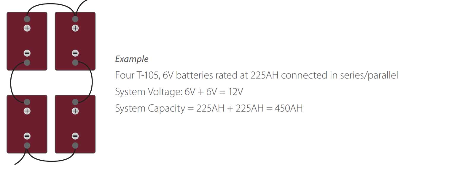 Most true deep cycle batteries are manufactured in a 6 volt configuration. This is handy for several reasons. Batteries can be connected in series or parallel to increase capacity or voltage. For example two T-105 6-volt batteries with a 225 AH (amp hour capacity) can be connected in parallel to create a 6-volt battery bank of 450 AH’s. Connected in series, two of these batteries will create a 12 volt battery bank of 225 AH’s. Four T-105 6-volt batteries connected in series/parallel will create a 12-volt battery bank of 450 AH’s.