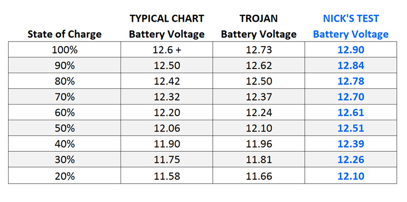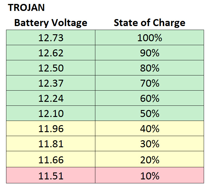 Another chart I often see is from the Trojan Battery website and it is a little better, but doesn’t match my real world experience, although it is more realistic than the chart typically posted on the Internet.