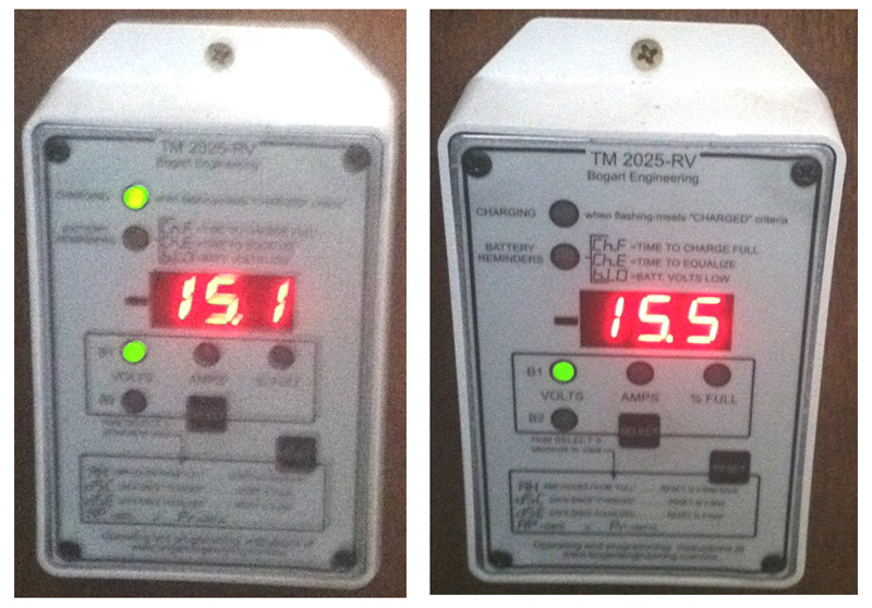 In winter, it is not unusual for my solar controller to raise the daily charge rate from 14.8 volts to 15.1 or even 15.5 volts as shown in the pictures below from the TriMetric 2025 battery monitor.