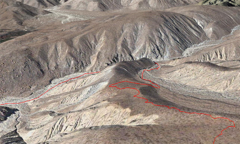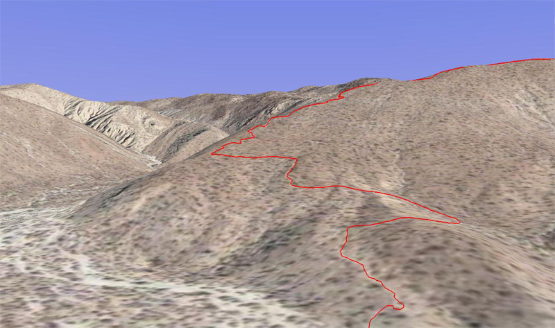 The picture above is a Google Earth picture of area, and the red line represents the route I hiked. Below is another Google Earth picture of the hike, but I turned it on its axis to provide a representation of the elevation of the hike. There is no water available on the loop, except for Coyote Creek, a perennial stream in Coyote Canyon. The water in this creek is hard to get to at the junction of the Box Canyon wash, due to thick reeds and is usually rather silty. It is best to hike up Coyote Creek, where the water quality improves. To avoid the extra mileage, I carried enough water to complete the hike, which was 3 liters.