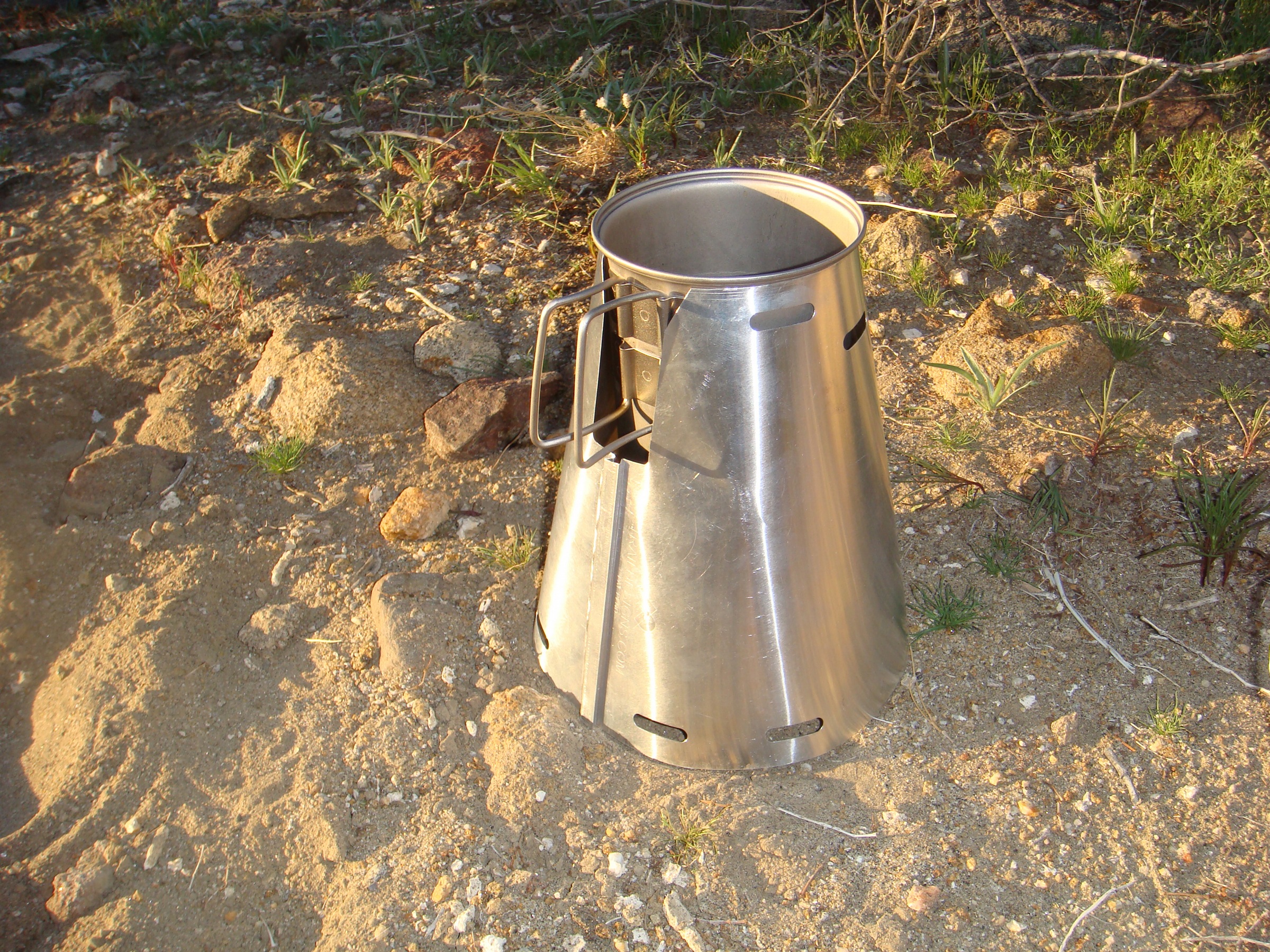 My friend John Oldford, who works at MSX, suggested I try an alcohol stove made from a cat food or cola can. John has a lot of ultralight backpacking experience, as he hiked the entire 2,600+ miles of the Pacific Crest Trail in 2003. Extremely light and they use just about any kind of alcohol, but denatured alcohol works best. This set up will boil 16 ounces of water in less than 7 minutes. A nifty windscreen, called a Caldera Cone helps the efficiency of the can stove.