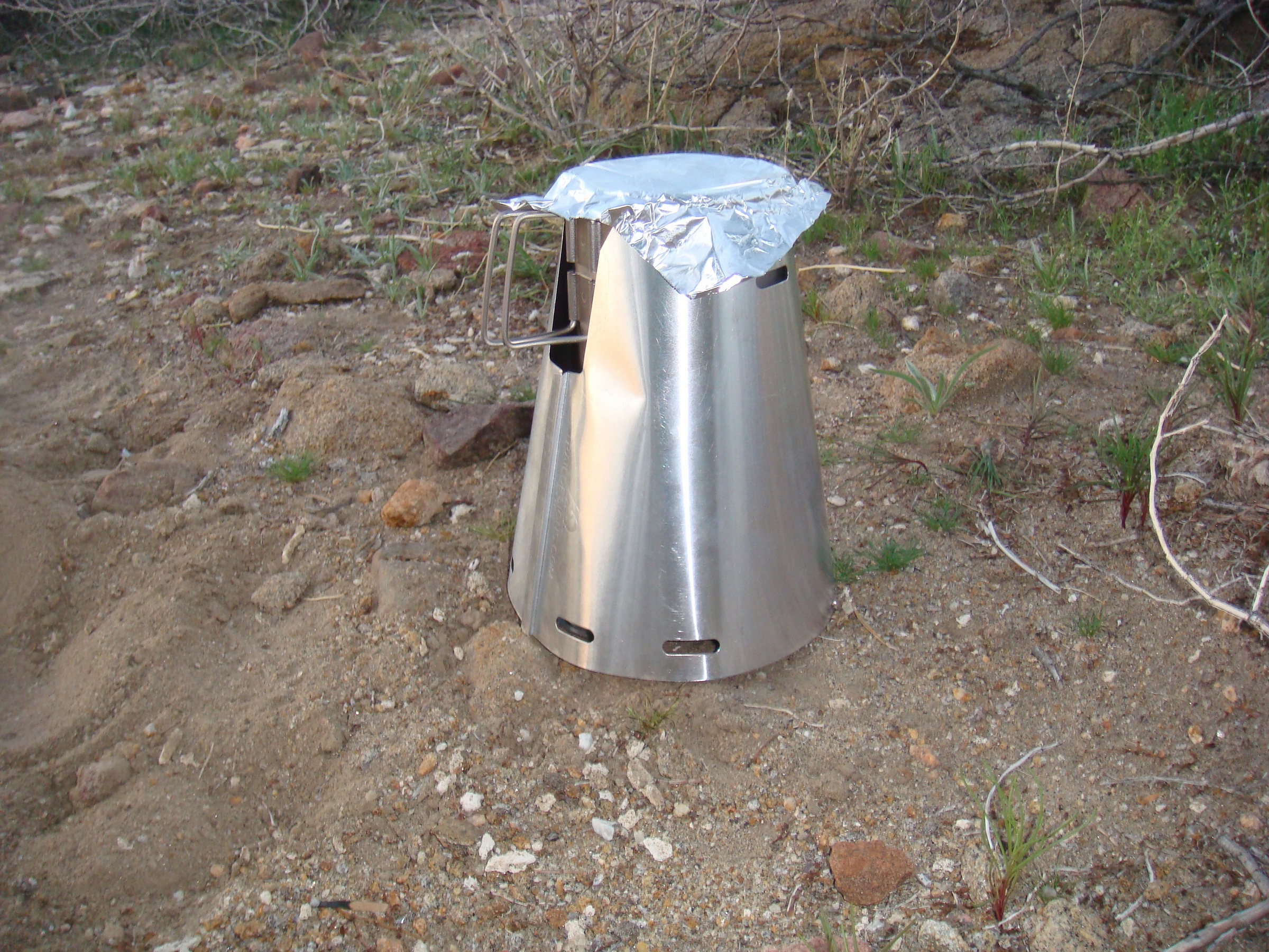 bottle, stove, cone, titanium spoon, foil; close up of my Dr. Pepper can stove; Stove is in the cone and the pot slides in; and Tin foil pot cover, to save weight.