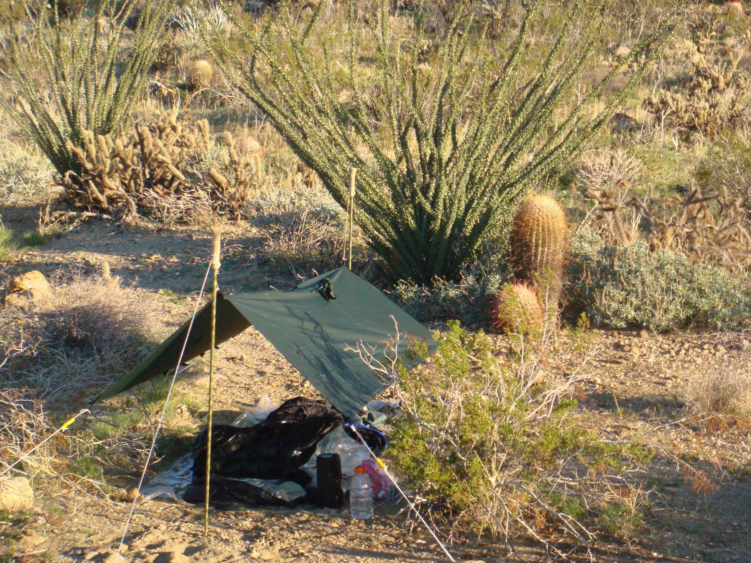 After leaving walking through the playa and entering the Coyote Canyon watershed above Box Canyon, one must stay on the ridges above the canyon, until your are close to the mouth of the canyon. There are remnants of an ancient Native American trail, but it is more work to try to find the trail, than just hiking cross-country. As the picture shows, the area is rolling and rocky. However, I made excellent time, and before 3:00PM, I had already hiked around 15 miles. I decided to head away from the ridge of Box Canyon and locate a campsite with a view. About one mile south of the canyon, I found this spot. It would provide me ample time to test a couple pieces of new gear.
