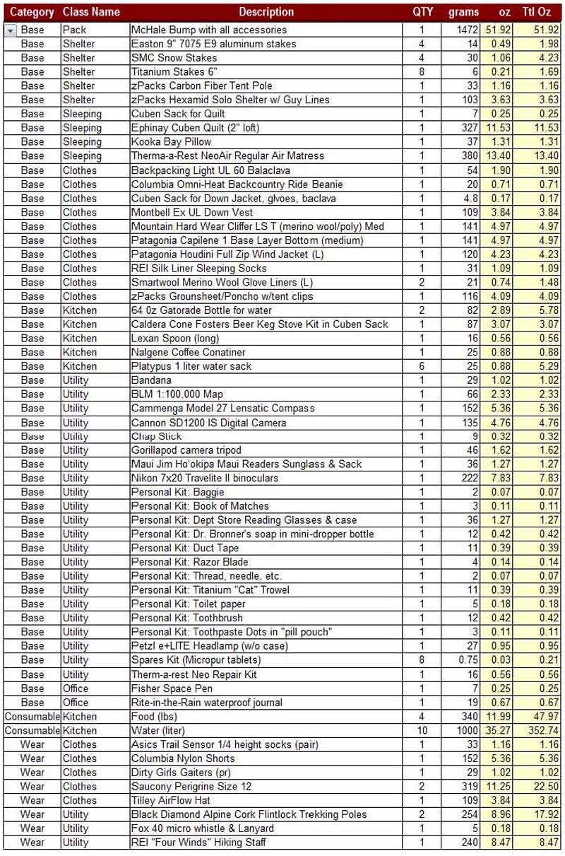 The McHale Bump pack thoroughly exceeded my expectations. Handles 35 lbs with ease, and the internal aluminum stays inside the pack are used as the frame, keeping the pack close to my center of gravity. This was an expense that was well worth the investment. The only difficulty through the entire purchase process was figuring out what material to make it from. Dan McHale wanted to make it from CubenTech fabric. I am leery of Cuben for the long term (as you can see in the pictures of my quilt above, as I expect this pack to last for at least a couple decades, and no one has used cuben for that long in a pack to report on its durability. The Cuben that Dan uses is a hybrid with a polyester laminate and he has tested it thoroughly. So I opted for Dyneema X Grid. The fabric Dan uses has the Dyneema threads spaced at 3/16” of an inch, versus the ¼” most of the UL manufacturers use. So his has about 25% more Dyneema thread in it. The pack has a full Dyneema bottom and the back of the straps is also made from full Dyneema. Dyneema is the strongest material known, and has replaced Aramid as the preferred material used to make military bullet-proof vests. The front of the pack has a mesh panel to help with sweat.