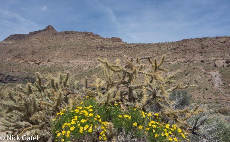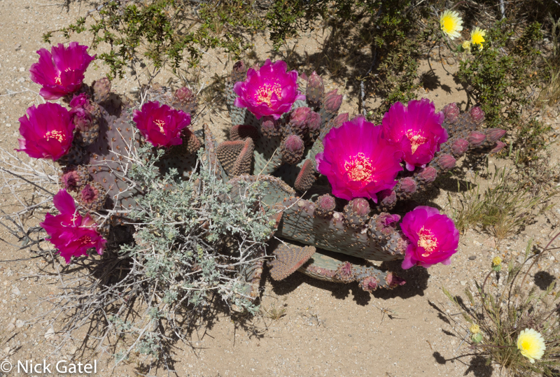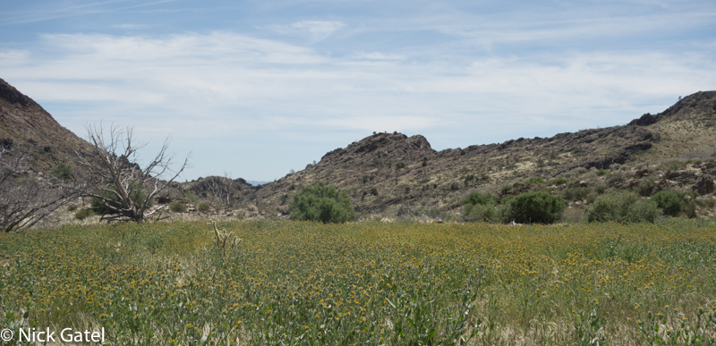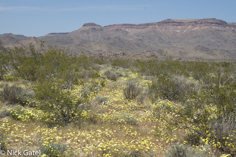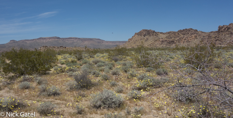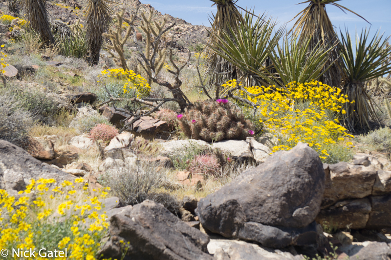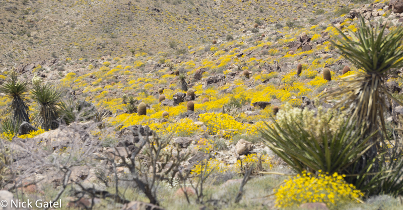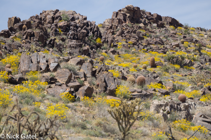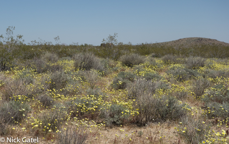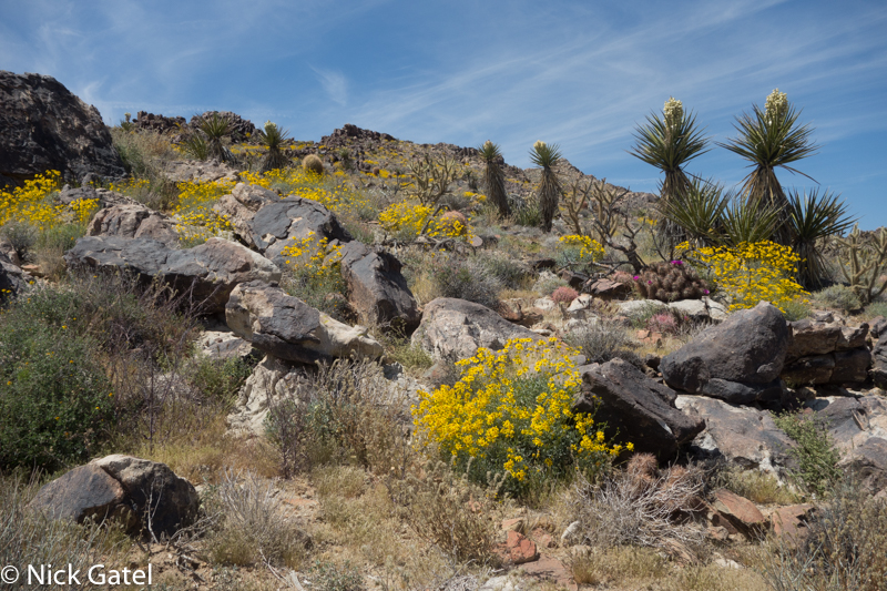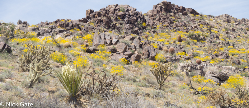 At lower elevations, where the Mojave and Lower Colorado Deserts meet, the bloom had past its peak. Mid elevations of the Mojave were in full color-glory, and the highest elevations were just starting to bloom — probably peaking in a couple of weeks after we left. But there was enough eye candy flowers to please our visual palates.