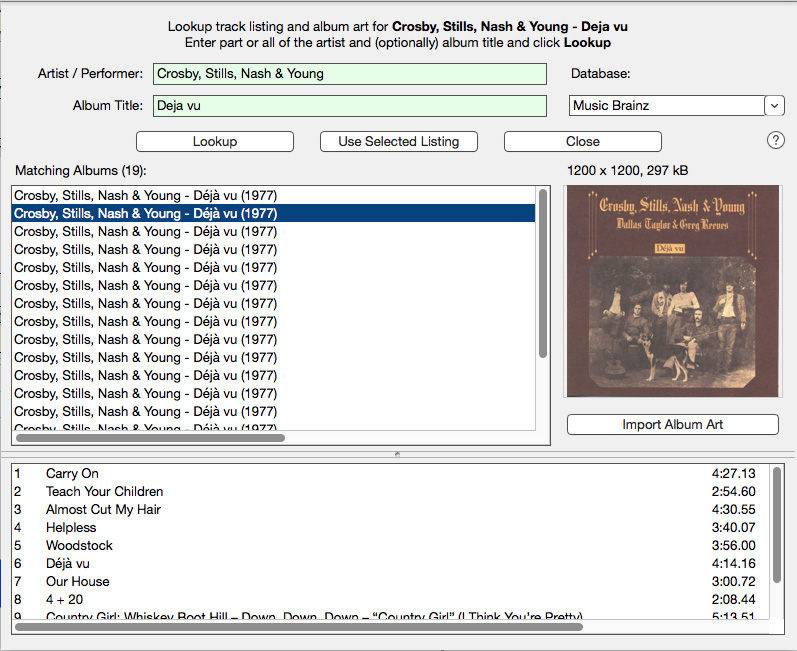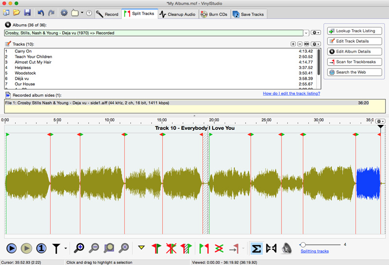 VinylStudio will search the Internet for databases that have the track names and length. Most are from CD’s, so the timing is usually a little off and the dates are usually the date the CD was released, not the vinyl album. But it is quick and easy to drag the track breaks to the proper position.