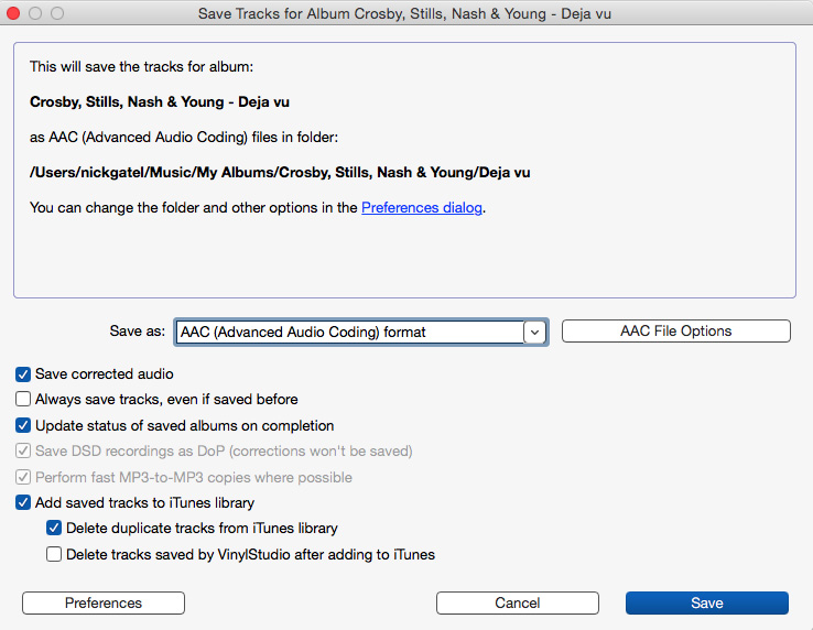 VinylStudio saves the files for your device, which for an Apple device is MPEG-4 Audio file (.m4a). It also saves the file in VinylStudio’s native format AIFF at 44 kHz 16 bit, which is a huge fie. A singe album is usually over 500MB, but the good thing is you can go back and edit the original file and re-save it to your playback device. Just make sure you have a large backup drive J