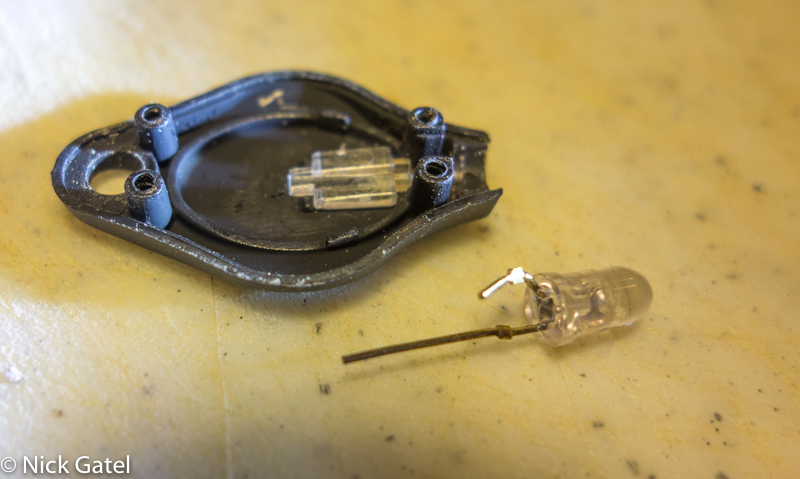 There is a small groove in the switch, and the long wire on the LED light will lay in that groove. If you haven’t bent the wire, it will pretty much fall into place. But we aren’t ready for that right now.