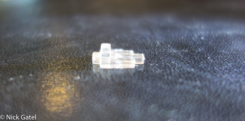 Left to Right: Old batteries, screws, bottom, top, switch, LED bulb. Be gentle with the LED light’s wires, you don’t want to bend them. You can barely see the switch in the picture, so here’s a close up below.