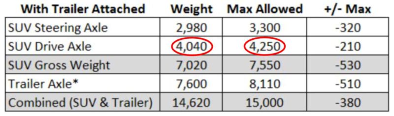Okay. A while back I wrote a post about trailer tongue weight. In it I shared the actual weights of the SUV’s axles and the Max Allowed by Ford. Here it is below.