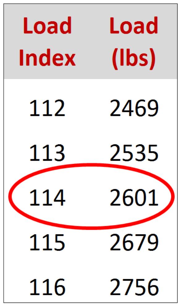 The public cannot access the TRA website, but at the end of this post I’ll provide some links for you to find all this tire information. Load Index Ratings go from 1 – 150. For now, here is the source for the load rating of 114.
