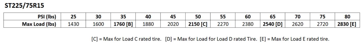 The combined capacity of all the trailer tires must be equal to or exceed the Gross Vehicle Weight (GVW) specification for the axles of the trailer. I like to have the load capacity of all the tires exceed the total trailer weight by about 20%. Our trailer weighs around 8,600 lbs. fully loaded, so I want the total capacity of the tires to be at least 10,320 lbs. or 2,550 lbs. for each tire. Here is the Tire Inflation & Load Chart for our ST225/75R15 tires. Note that trailer tires use the size designation “ST” versus “P” for passenger tires or “LT” for light truck tires.